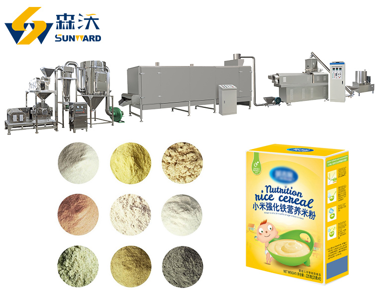 Nutritional rice milk powder making machine for baby food uses rice, corn, beans and all kinds of grains as the raw materials. Through extruding, inflating, drying, crushing and mixing, it could produce many kinds of nutritional powder. Such as baby rice powder, sesame paste, beans powder and so on. This line could finish all the process automatically from the feeding to the end. It has features of easy operation, no leak of powder dust, sanitation, energy-saving and adding all kinds of raw materials and nutriment asily.